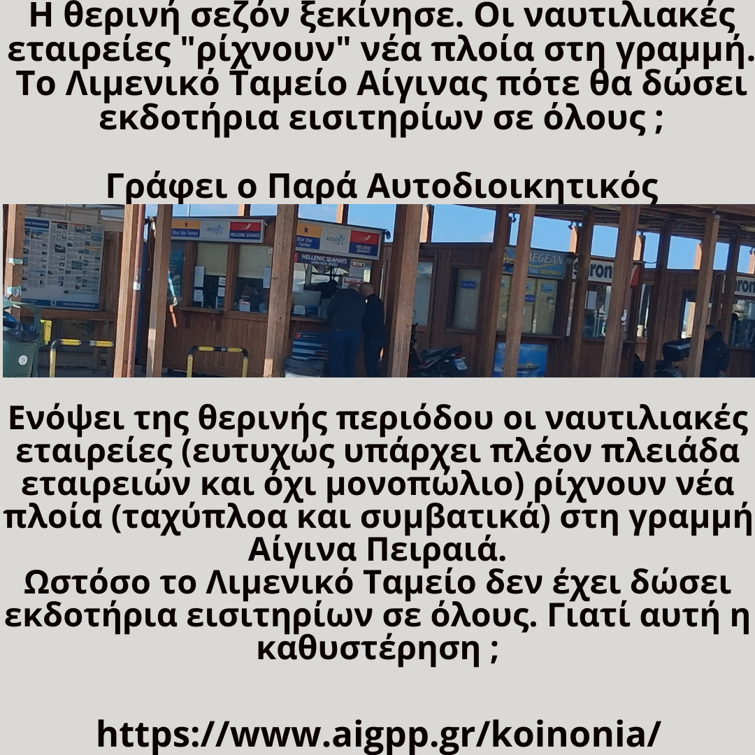 Η θερινή σεζόν ξεκίνησε. Οι ναυτιλιακές εταιρείες "ρίχνουν" νέα πλοία στη γραμμή. Το Λιμενικό Ταμείο Αίγινας πότε θα δώσει εκδοτήρια εισιτηρίων σε όλους;