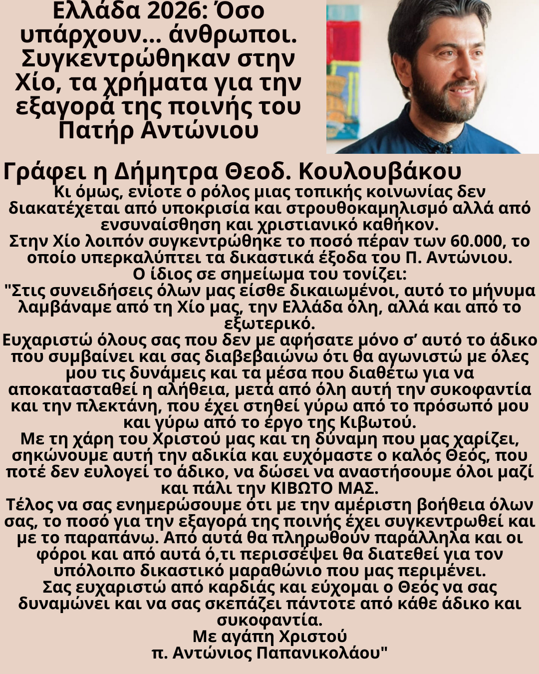 Συγκεντρώθηκαν στην Χίο, τα χρήματα για την εξαγορά της ποινής του Πατήρ Αντώνιου.