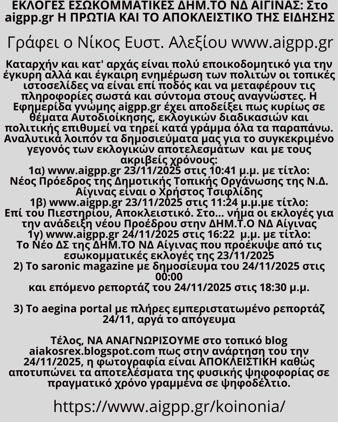 ΕΚΛΟΓΕΣ ΕΣΩΚΟΜΜΑΤΙΚΕΣ ΔΗΜ.ΤΟ ΝΔ ΑΙΓΙΝΑΣ: Στο aigpp.gr Η ΠΡΩΤΙΑ ΚΑΙ ΤΟ ΑΠΟΚΛΕΙΣΤΙΚΟ ΤΗΣ ΕΙΔΗΣΗΣ