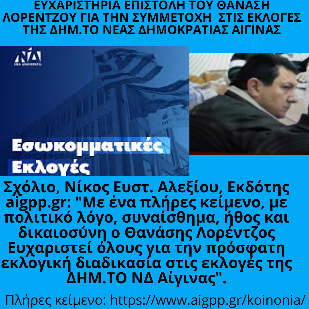 ΕΥΧΑΡΙΣΤΗΡΙΑ ΕΠΙΣΤΟΛΗ ΤΟΥ ΘΑΝΑΣΗ ΛΟΡΕΝΤΖΟΥ ΓΙΑ ΤΗΝ ΣΥΜΜΕΤΟΧΗ ΣΤΙΣ ΕΚΛΟΓΕΣ ΤΗΣ ΔΗΜ.ΤΟ ΝΕΑΣ ΔΗΜΟΚΡΑΤΙΑΣ ΑΙΓΙΝΑΣ