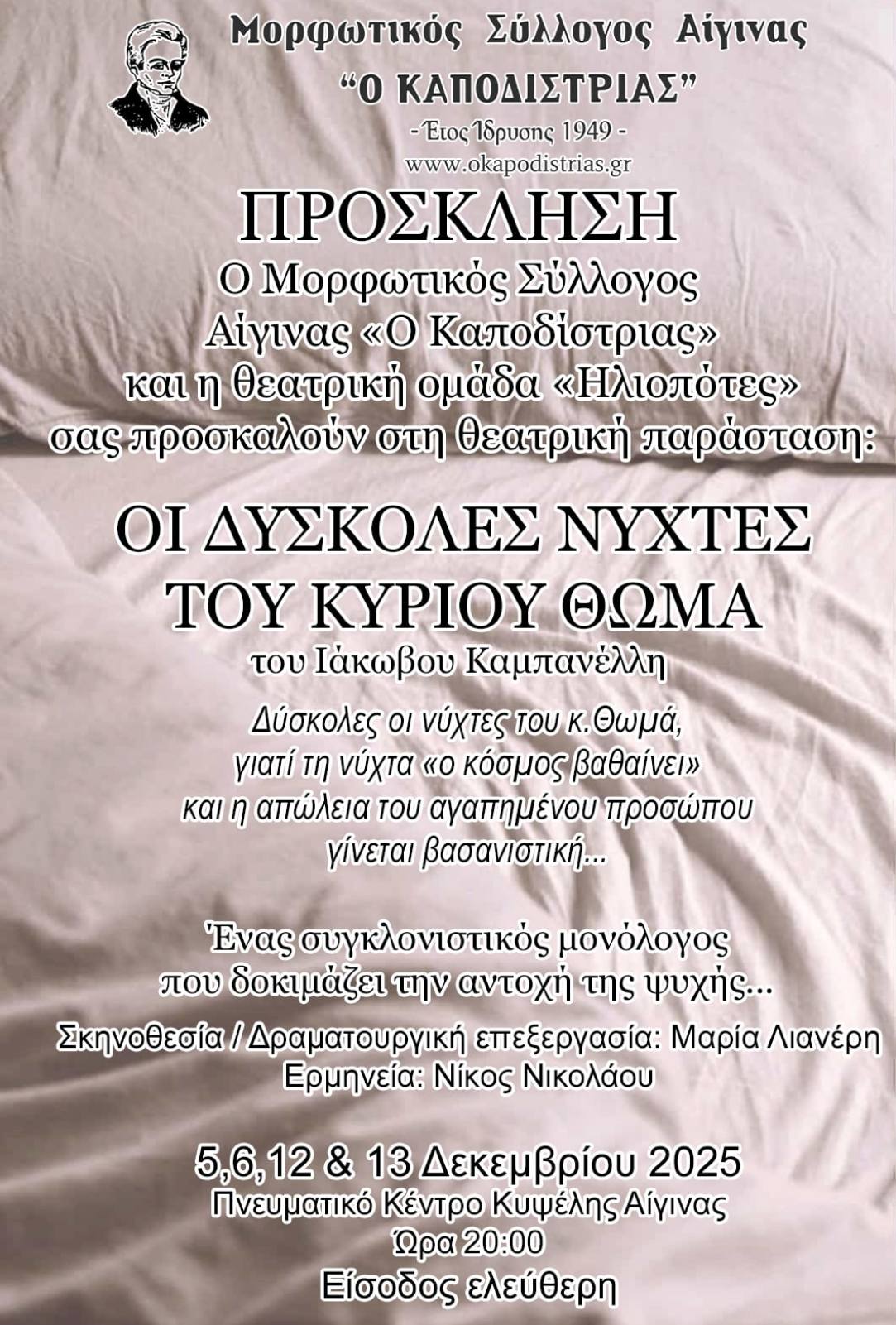 Ο Μορφωτικός Σύλλογος Αίγινας «Ο Καποδίστριας»και η Θεατρική Ομάδα «Ηλιoπότες»σας προσκαλούν στη θεατρική παράσταση: «ΟΙ ΔΥΣΚΟΛΕΣ ΝΥΧΤΕΣ ΤΟΥ ΚΥΡΙΟΥ ΘΩΜΑ»του Ιάκωβου Καμπανέλλη