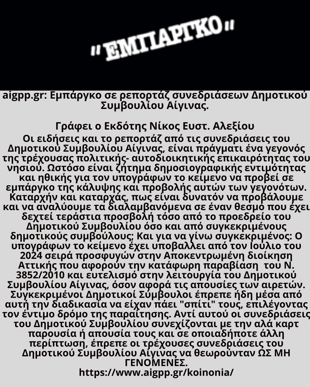 Ο τρόπος με τον οποίο διαδραματίστηκαν οι τελευταίες εκλογές είναι πλέον γνωστός. Στήθηκε ένας συνδυασμός της αντιπολίτευσης και με παρέμβαση βουλευτικού γραφείου ενισχύθηκε η εν ενεργεία δημοτική παράταξη. Μετά την εξασφάλιση "της γυάλας με τα χρυσόψαρα" αρκετοί από τους συμβούλους που συνέβαλαν αποφασιστικά στην διαμόρφωση του εκλογικού αποτελέσματος απήχαν των δημοτικών συμβουλίων. Μόνο που κάποιος ο οποίος έχει έννομο συμφέρον ασχολήθηκε με το θέμα και προέκυψαν ενδιαφέροντα αποτελέσματα. Σύμφωνα με έγγραφο του Προέδρου του Δημοτικού Συμβουλίου, από την 1/8/2024, προς την Αποκεντρωμένη Διοίκηση Αττικής ενημερώνεται η Εποπτεύουσα Αρχή πως τρεις Αιρετοί της Πλειοψηφίας του Δήμου έχουν αντίστοιχα: Αιρετός (Α): 16 Απουσίες από συνεχόμενες συνεδριάσεις του Δημοτικού Συμβουλίου Αίγινας. Αιρετός (Β): 3 Απουσίες από συνεχόμενες συνεδριάσεις του Δ.Σ. Αίγινας. Αιρετός (Γ): 3 Απουσίες από συνεχόμενες συνεδριάσεις του Δ.Σ. Σύμφωνα με ανεπιβεβαίωτες δημοσιογραφικές πληροφορίες το έγγραφο, προέκυψε μετά από Προσφυγή Αναπληρωματικού Αιρετού της Πλειοψηφίας προς την Αποκεντρωμένη. Όσον αφορά το μέλλον της υπόθεσης σύμφωνα και με την ισχύουσα νομοθεσία (άρθρο 68 του ν. 3852/2010) οι πειθαρχικές ποινές για τους Αιρετούς (Α), (Β) και (Γ) προβλέπουν Αργία ή Έκπτωση ενώ για τον Πρόεδρο του Δημοτικού Συμβουλίου προβλέπεται σοβαρή παράβαση καθήκοντος. Αναμένοντας τις εξελίξεις...