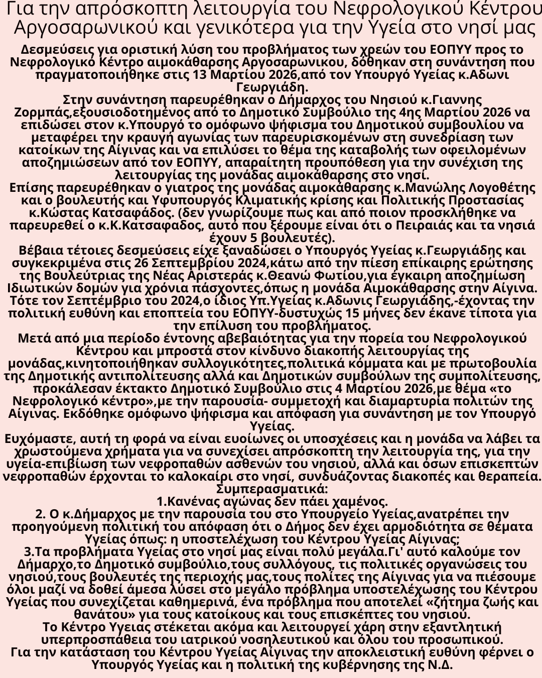 Στην συνάντηση παρευρέθηκαν ο Δήμαρχος του Νησιού κ.Γιαννης Ζορμπάς,εξουσιοδοτημένος από το Δημοτικό Συμβούλιο της 4ης Μαρτίου 2026 να επιδώσει στον κ.Υπουργό το ομόφωνο ψήφισμα του Δημοτικού συμβουλίου να μεταφέρει την κραυγή αγωνίας των παρευρισκομένων στη συνεδρίαση των κατοίκων της Αίγινας και να επιλύσει το θέμα της καταβολής των οφειλομένων αποζημιώσεων από τον ΕΟΠΥΥ, απαραίτητη προυπόθεση για την συνέχιση της λειτουργίας της μονάδας αιμοκάθαρσης στο νησί.