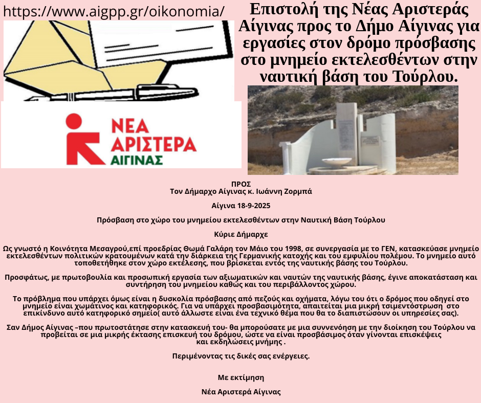 Επιστολή της Νέας Αριστεράς Αίγινας προς το Δήμο Αίγινας για εργασίες στον δρόμο πρόσβασης στο μνημείο εκτελεσθέντων στην ναυτική βάση του Τούρλου.