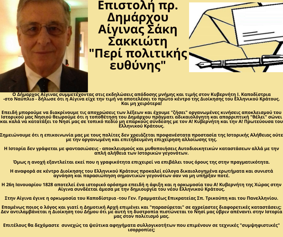 Επιστολή πρ. Δημάρχου Αίγινας Σάκη Σακκιώτη: "Περί πολιτικής ευθύνης"