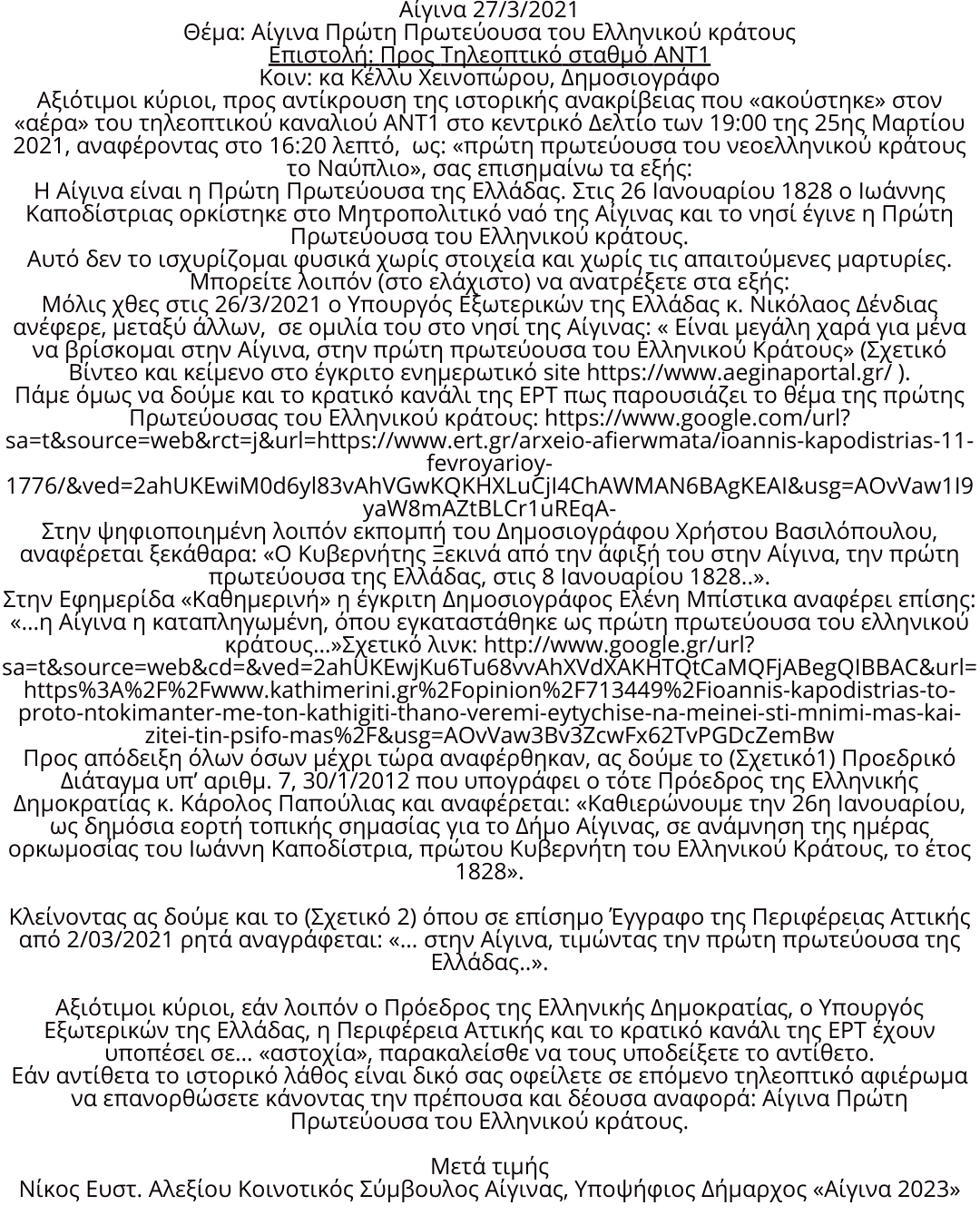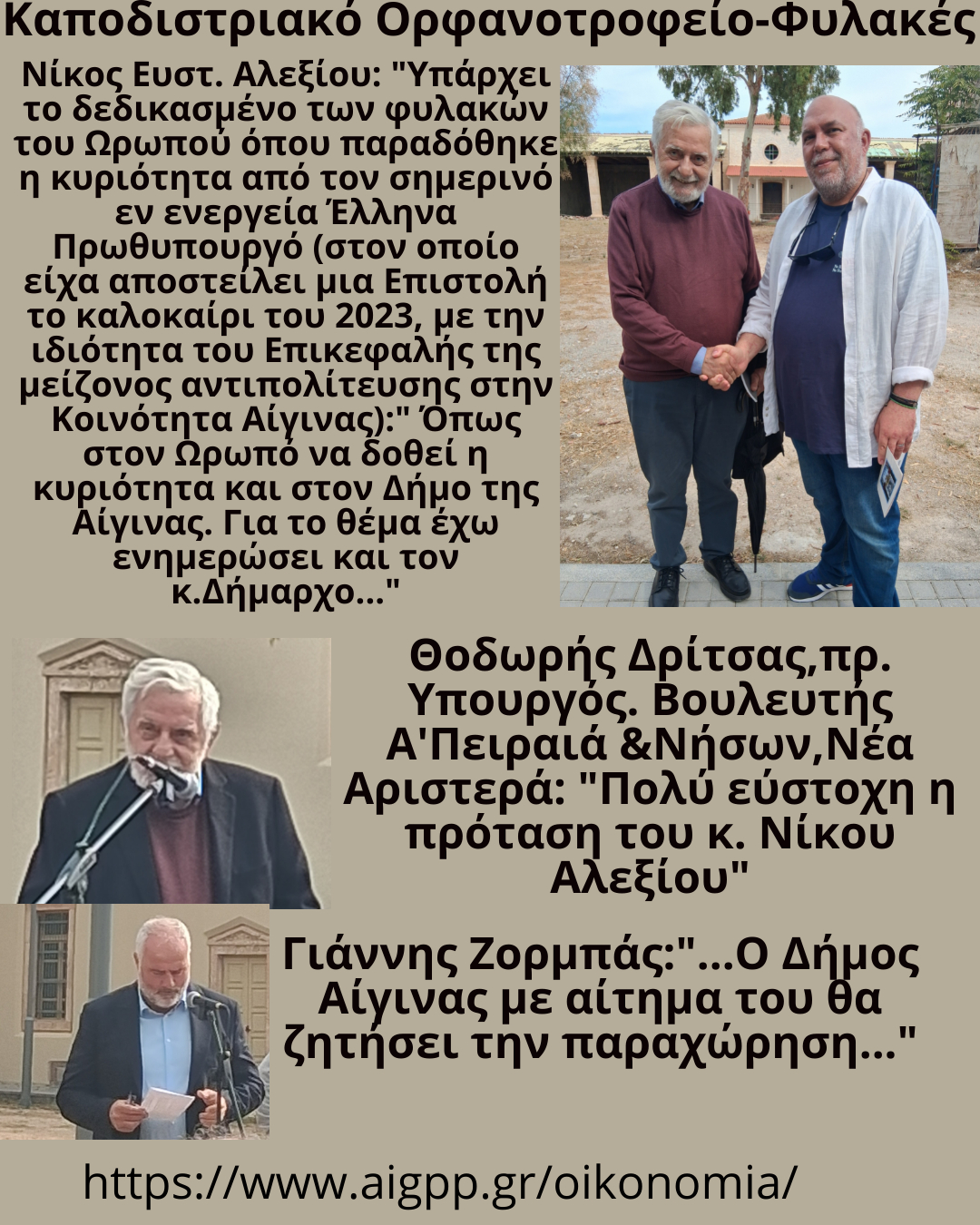 ΥΓ: Αν κάποτε αποδοθούν οι Φυλακές της Αίγινας (Καποδιστριακό Ορφανοτροφείο) εξ ολοκλήρου στον Αιγινήτικο λαό, όπως έχω ζητήσει με την από 14/7/2023 Επιστολή μου προς τον Έλληνα Πρωθυπουργό, ελπίζω να μην έχουμε τα ίδια φαινόμενα πολιτικής... αμνησίας.