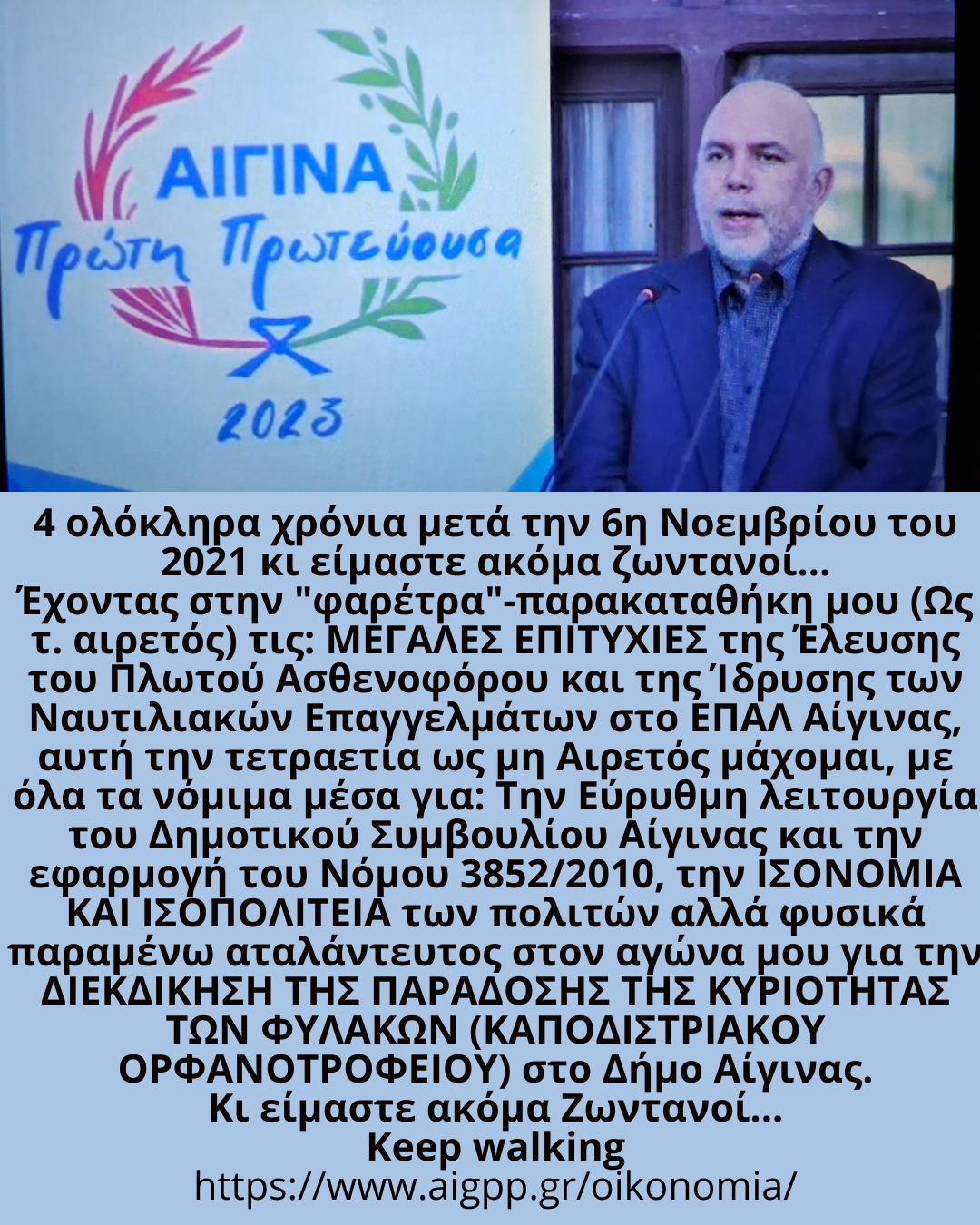 Έχοντας στην "φαρέτρα"-παρακαταθήκη μου (Ως τ. αιρετός) τις: ΜΕΓΑΛΕΣ ΕΠΙΤΥΧΙΕΣ της Έλευσης του Πλωτού Ασθενοφόρου και της Ίδρυσης των Ναυτιλιακών Επαγγελμάτων στο ΕΠΑΛ Αίγινας, αυτή την τετραετία ως μη Αιρετός μάχομαι, με όλα τα νόμιμα μέσα για: Την Εύρυθμη λειτουργία του Δημοτικού Συμβουλίου Αίγινας και την εφαρμογή του Νόμου 3852/2010, την ΙΣΟΝΟΜΙΑ ΚΑΙ ΙΣΟΠΟΛΙΤΕΙΑ των πολιτών αλλά φυσικά παραμένω αταλάντευτος στον αγώνα μου για την ΔΙΕΚΔΙΚΗΣΗ ΤΗΣ ΠΑΡΑΔΟΣΗΣ ΤΗΣ ΚΥΡΙΟΤΗΤΑΣ ΤΩΝ ΦΥΛΑΚΩΝ (ΚΑΠΟΔΙΣΤΡΙΑΚΟΥ ΟΡΦΑΝΟΤΡΟΦΕΙΟΥ) στο Δήμο Αίγινας.