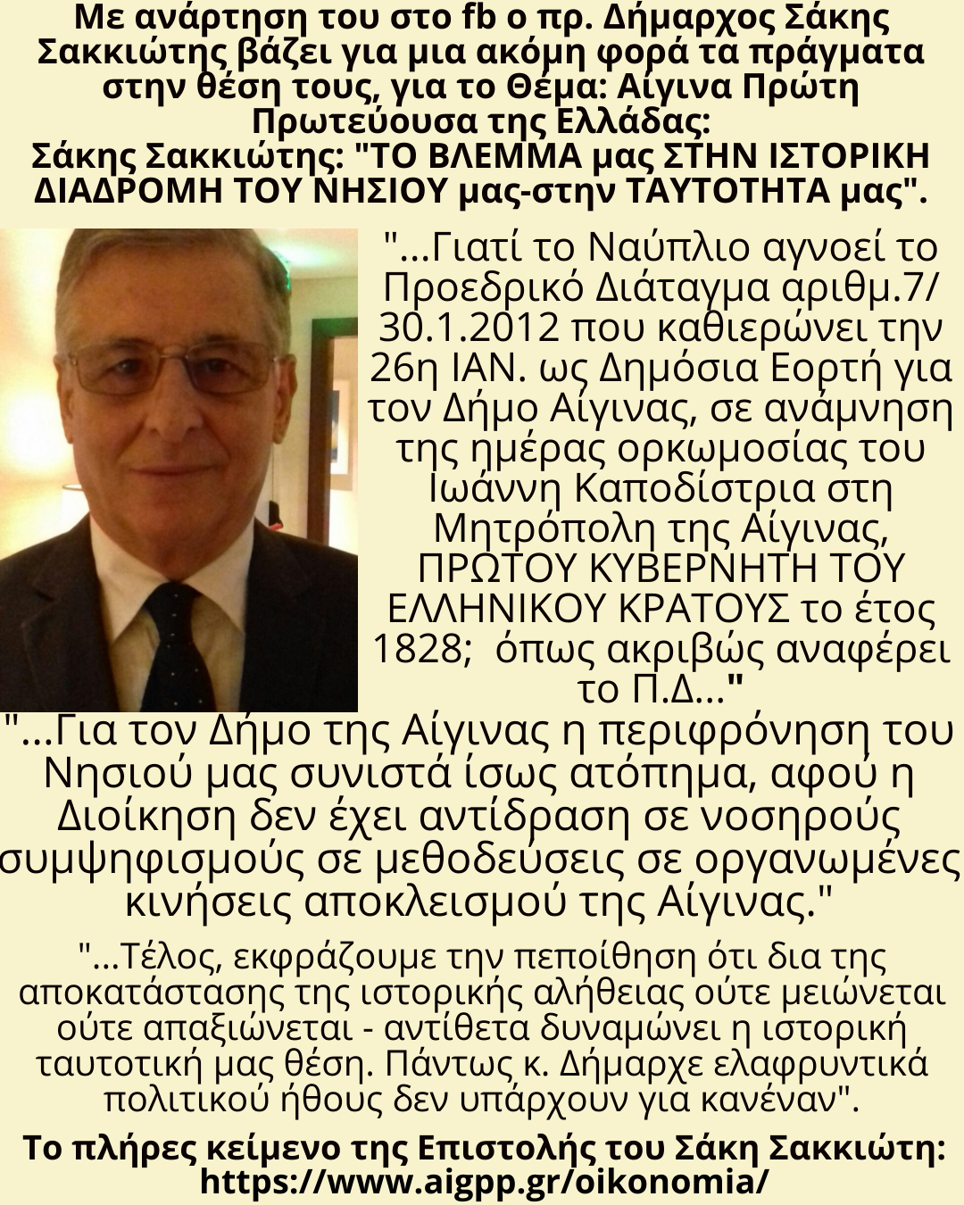 Με ανάρτηση του στο fb ο πρ. Δήμαρχος Αίγινας Σάκης Σακκιώτης βάζει για μια ακόμη φορά τα πράγματα στην θέση τους, για το Θέμα: Αίγινα Πρώτη Πρωτεύουσα της Ελλάδας: