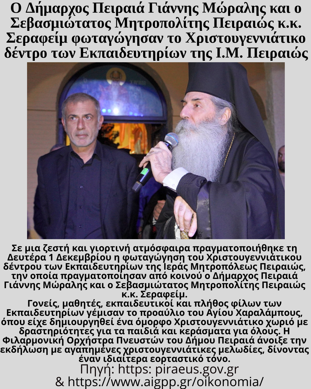 Ο Δήμαρχος Πειραιά Γιάννης Μώραλης και ο Σεβασμιώτατος Μητροπολίτης Πειραιώς κ.κ. Σεραφείμ φωταγώγησαν το Χριστουγεννιάτικο δέντρο των Εκπαιδευτηρίων της Ι.Μ. Πειραιώς